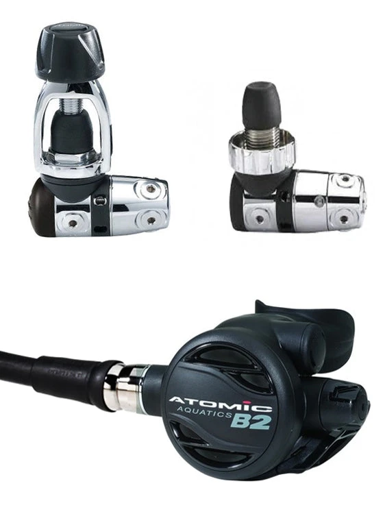 The B2 regulator is engineered from chrome plated brass and 316 stainless steel, to have the most comfortable second stage in the world, while being economical without sacrificing performance. The Atomic Aquatics B2 factory sealed first stage features the ‘Jet Seat’ high flow piston and 2 HP fixed ports and 5 LP ports on swivel cap. The second stage, made from titanium, has been designed with a high flow stage case to lower breathing effort and rapid adjustment knob for manual tuning and polished 316 stainless steel comfort swivel. The B2 is Nitrox ready up to 40%. and has a 2 year/ 300 dive service interval and non contingent lifetime warranty.