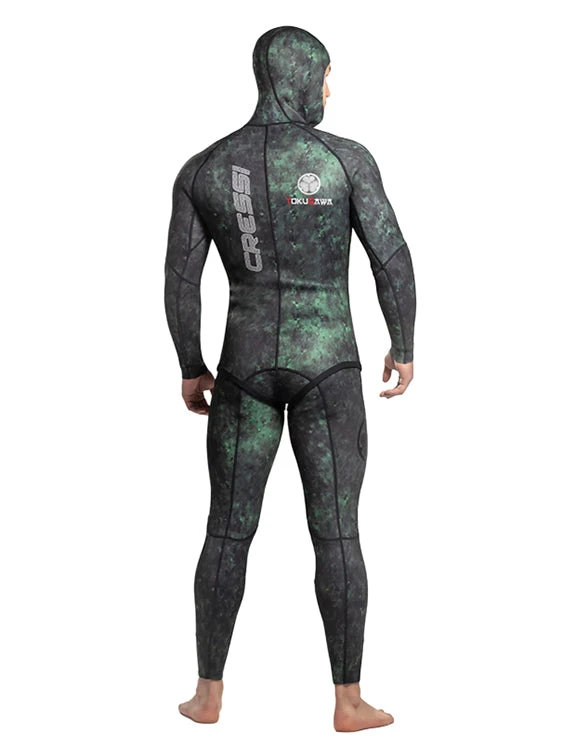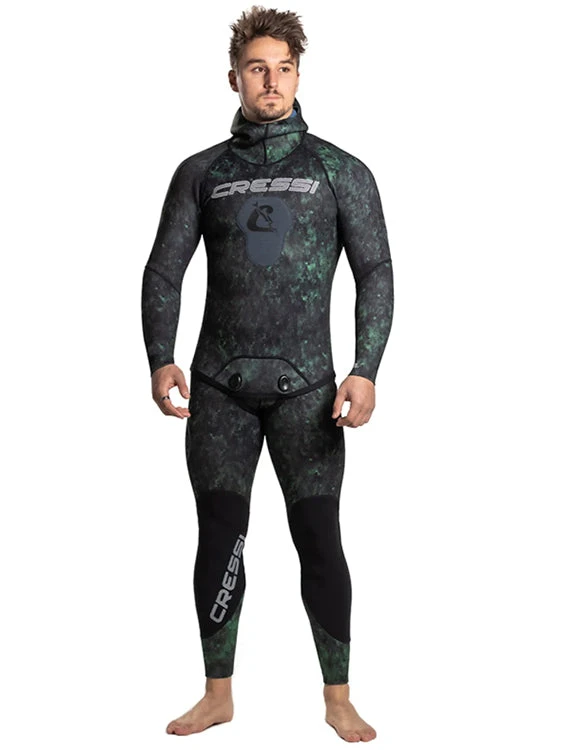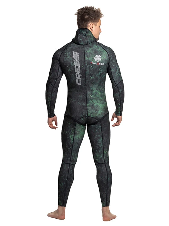 The Cressi Tokugawa XTR 3mm is a spearfishing (or freediving) 2-piece wetsuit for mens, conceived to be worn in Australian waters, featuring a green camouflaged pattern ideal for blending in with the clear water of Queensland to the green darker waters of south Western Australia.
