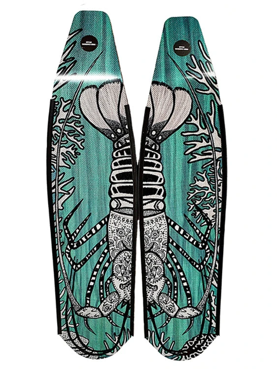 DiveR Freediving Fin Blades are made by hand for precision and their stunning designs.  The intricate design of the black and white Cray Fish on these blades is beautiful and contrasts perfectly with the aqua background. The two blades next to each other create the full design with which you will certainly stand out.Â