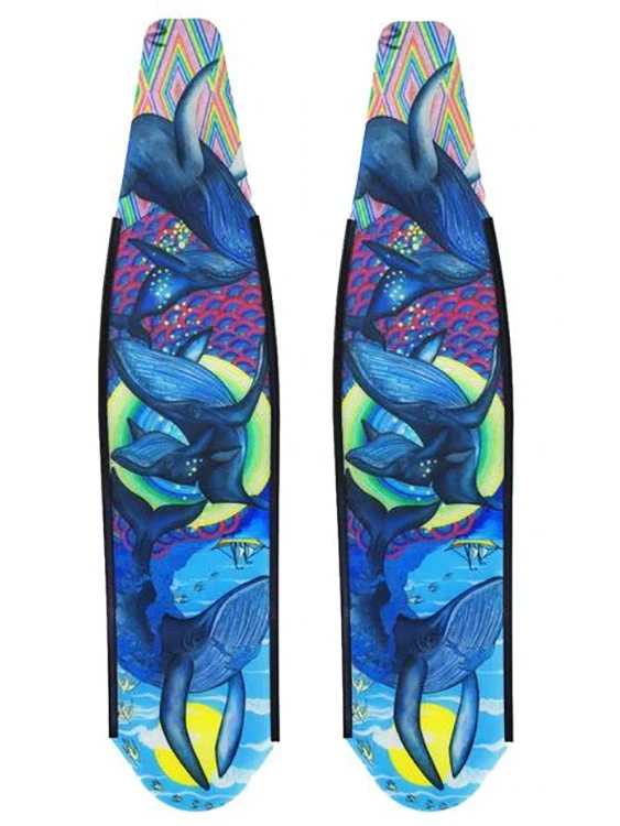 DiveR Freediving Fin Blades are hand crafted for precision with stunning designs. The Humpback fins are no exception to this, featuring one of our favourite whales, the beautiful humpback enjoying various backgrounds on these colourful fins. Attention grabbing with this bold design you will never get your fins mixed up with others on a dive boat again.Â