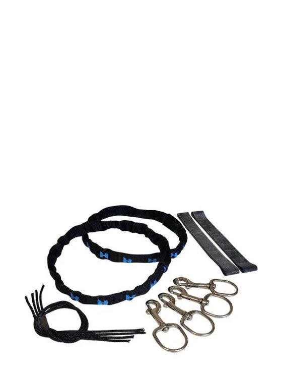 The Rigging Kit includes four 1” bolt snaps to clip your cylinders to your plate, two Stainless Steel Stage Clamps with the well-known Halcyon webbing covers that fit either an Aluminium 80’s or a steel tank, and two elastic EPDN bands to secure your regulator(s). Also included in the kit are 3mm nylon lines to attach you bolt snaps to the stainless steel stage clamps.
