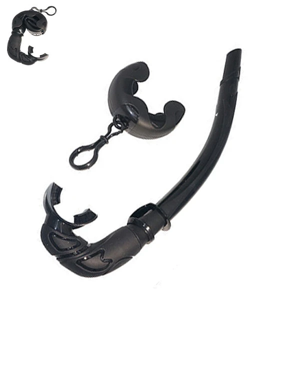 This folding snorkel allows you to carry with you at all times in the water but keeps it nicely out of the way. This roll-up snorkel comes with a holder and clip which can easily be clipped to your mask strap or BCD where it can be easily reached yet kept out of the way.Â