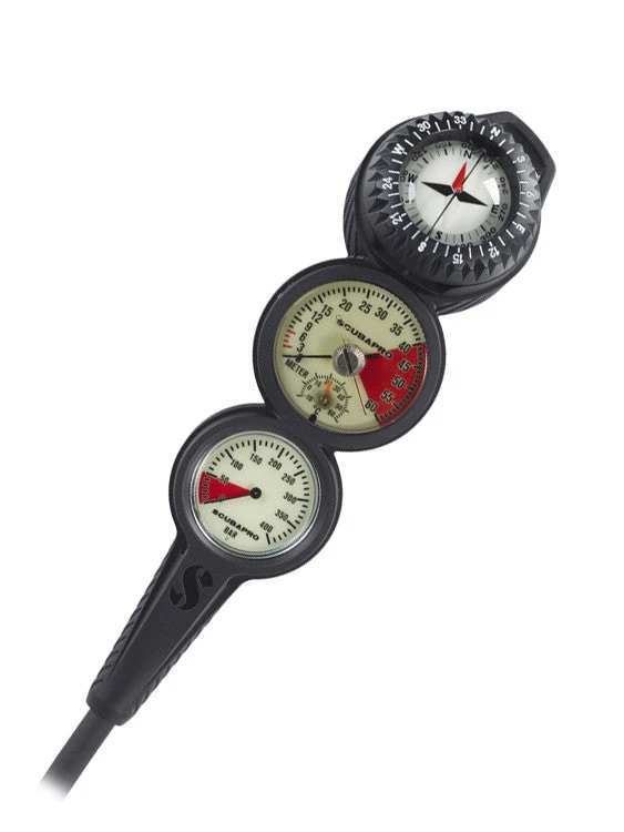 The Scubapro Compact SPG Triple Console consists of a booth with the Scubapro Compact SPG, Scubapro Depth Gauge and the Scubapro FS-2 Compass.Â
