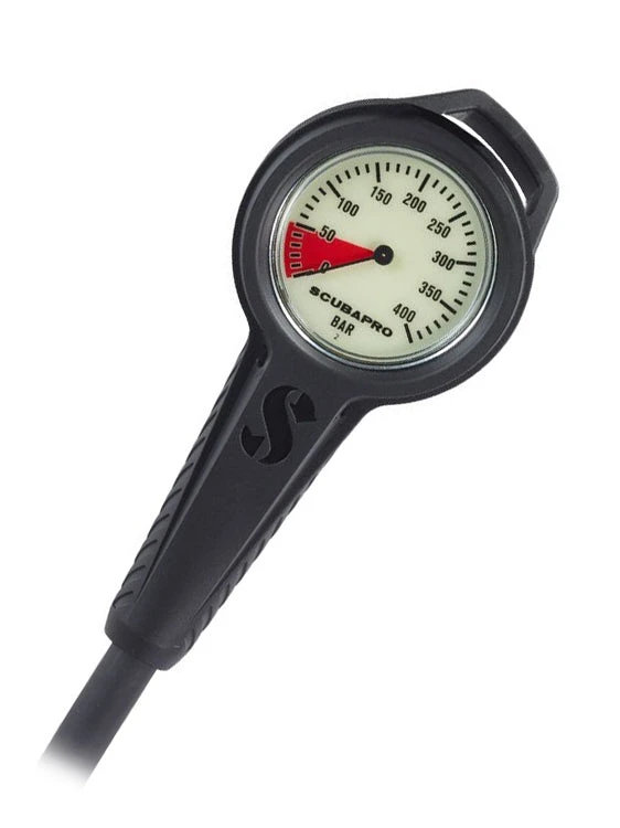 The SPG reads up to 400 bar and features the common red zone from 50 down to 0 bar. The indicator marks measure 10 bar increments. This SPG can serve either as a back-up for a transmitter, or as a primary gauge when diving with a wrist computer.