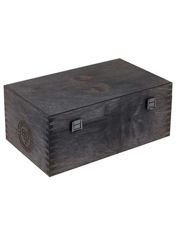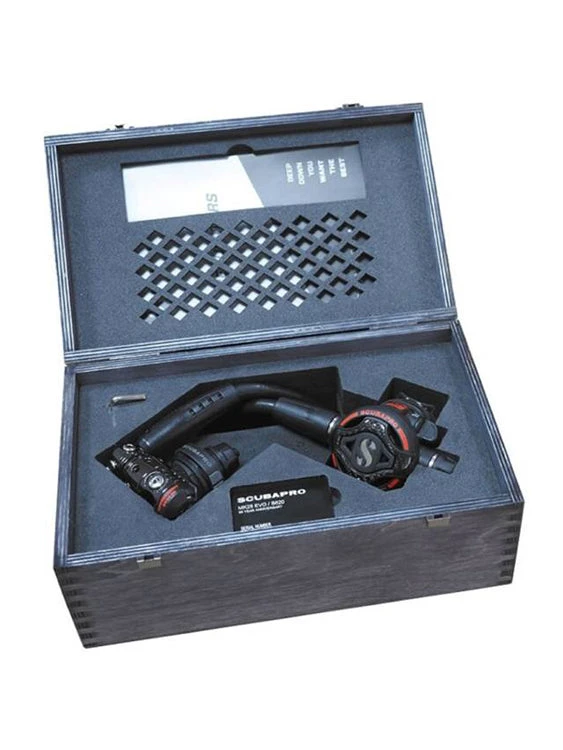 This limited edition regulator couldn’t come without a special case: a FSC-certified wooden box engraved with the Scubapro logo and the 60 Year Anniversary logo. It also carries a black anodised laser engraved aluminium tag with its progressive serial number.