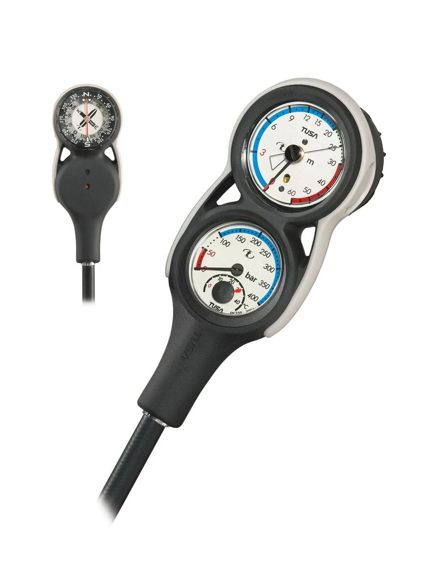 The SCA-360E is a newly redesigned 3 gauge console that provides continuous dive data in an easy-to-read format. Lightweight and efficient, the SCA-360 features a top and side view compass on the reverse side of the console and is engineered and manufactured to rigid quality and performance TUSA standards.